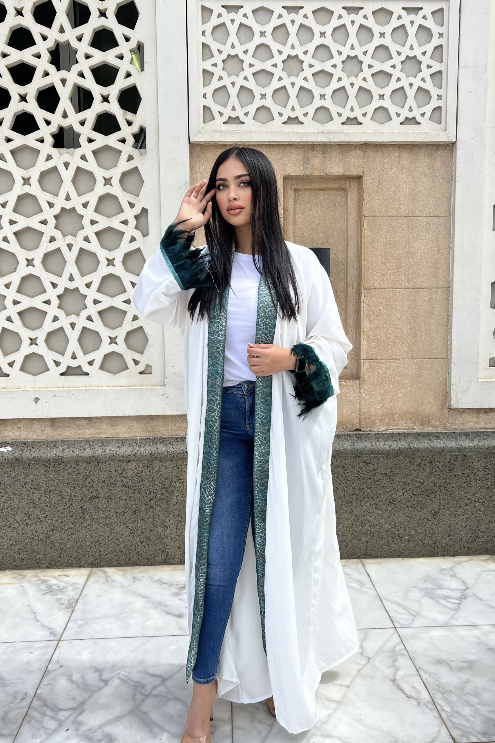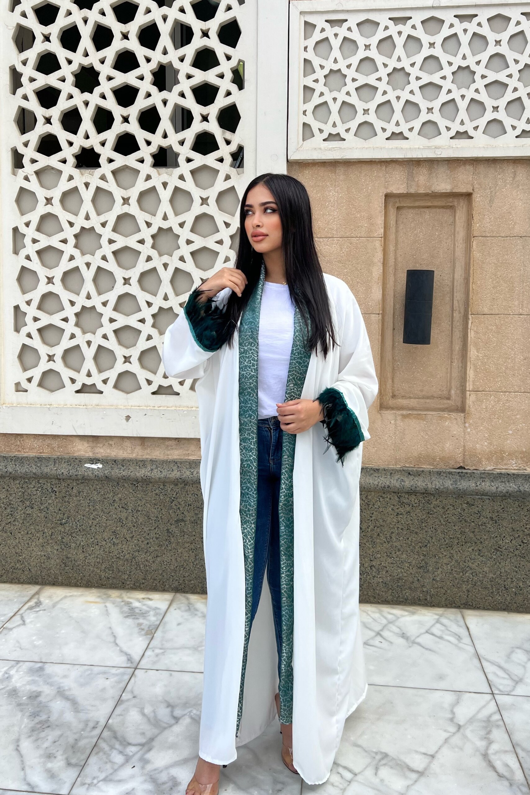 Stand out in a white feathered kaftan made just for you